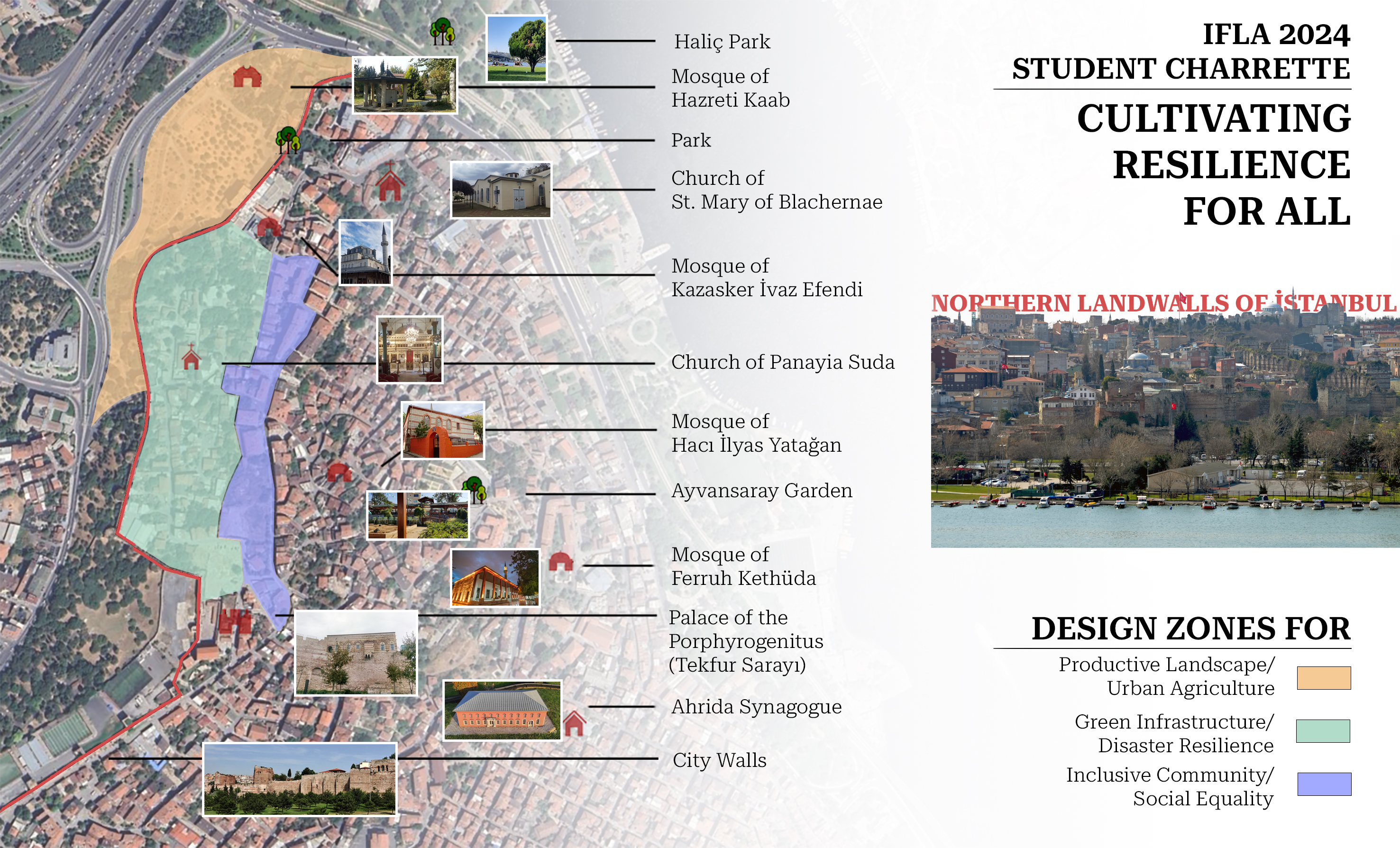 The area we will be studying in this year's IFLA 2024 Student Charette, located at the north-eastern corner of the historic peninsula, is an urban sample where many layers belonging to different periods of an ancient city try to coexist with the landscape. It includes a variety of land uses that serve different purposes. The most significant are residential, commercial, and green areas. A landscape is created by the 1600-year-old walls and their surroundings, which reflect the city’s history and the numerous complex cultural activities that have occurred there. Cemeteries, open spaces like parks, historical orchards/vegetable gardens-bostans-, courtyards of traditional Turkish Houses, city walls, fortifications, gates, towers, monuments from various historical periods, and buildings like traditional homes are some of the multi-layered tangible features of the cultural landscape.